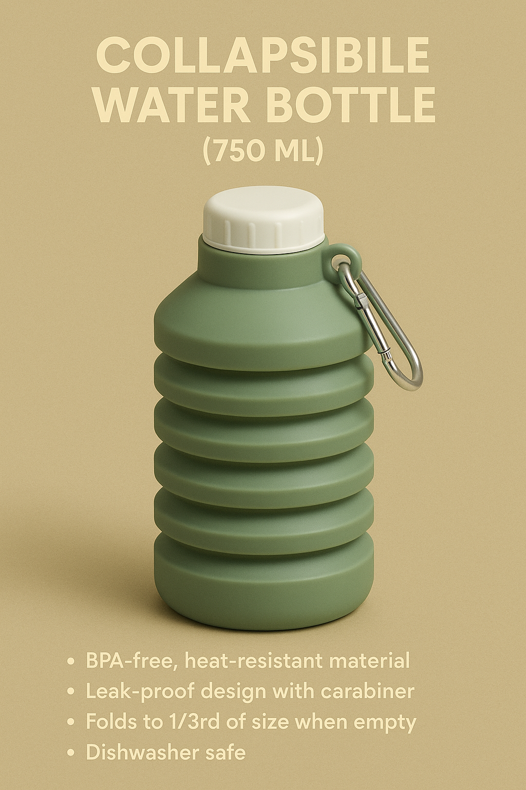 Description: Eco-friendly silicone water bottle that folds to half its size, easy to carry for treks and college.