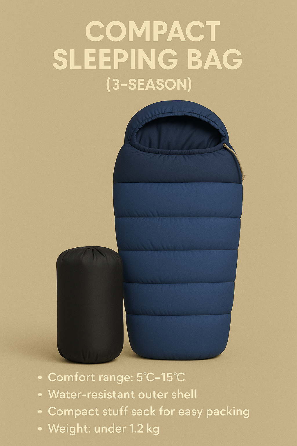 Description: Lightweight, rollable sleeping bag perfect for camping and treks in moderate temperatures.